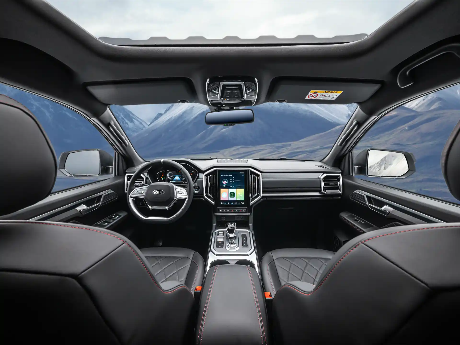 Pick-up T9 oferuje tapicerkę ze skóry ekologicznej oraz elektrycznie sterowane, podgrzewane fotele przednie, które zapewniają wygodę kierowcy i pasażerom w każdych warunkach.